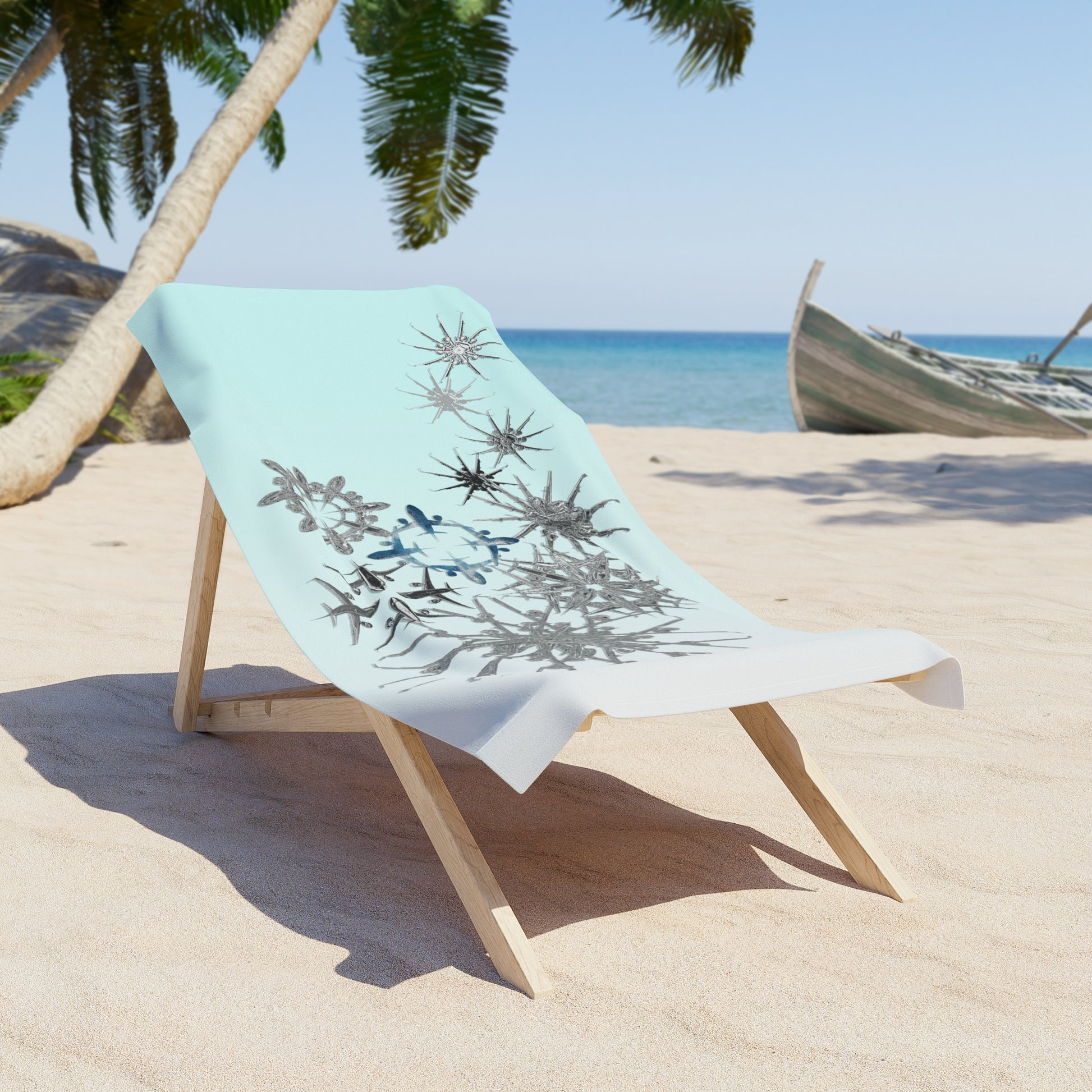 Inspired by snowflakes and flight paths, this design captures the fleeting magic of movement and the stillness found between destinations. Whether you’re stretched out by the sea or drying off after a morning swim, these aviation snowflakes bring wonder and wanderlust wherever they land.